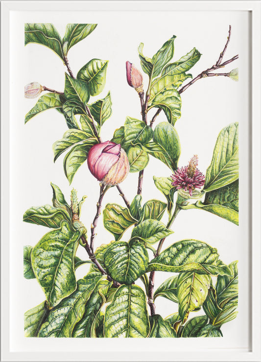 ‘Lost in the Garden’ is an intricate and attentive study of loss and discovery, captured in the Rococo Dahlia, Wild Blackberry, Black Doris Plum, and Black Tulip Magnolia.